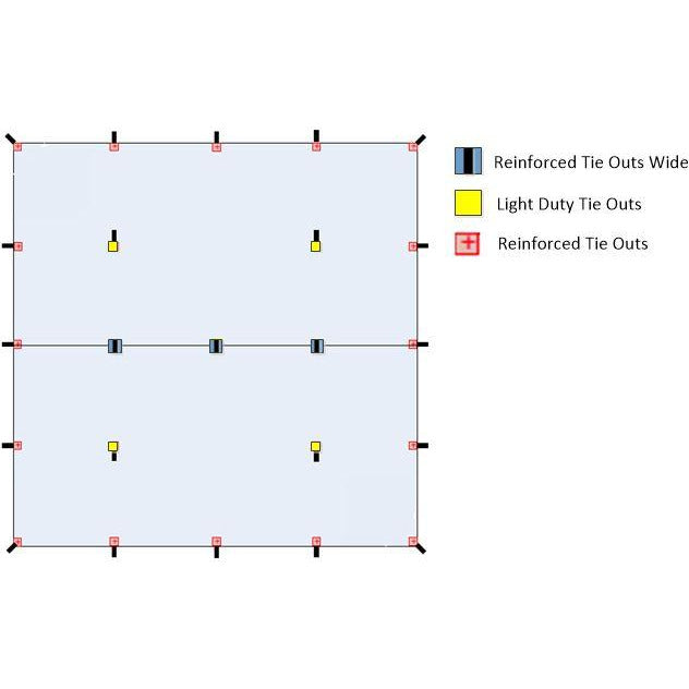 The REFLECT HT has 19 outside reinforced tie outs, 4 side tie outs and 1 interior tie out. Currently the REFLECT G2 comes in only one size witch is a 9'4*9'4 square tarp.